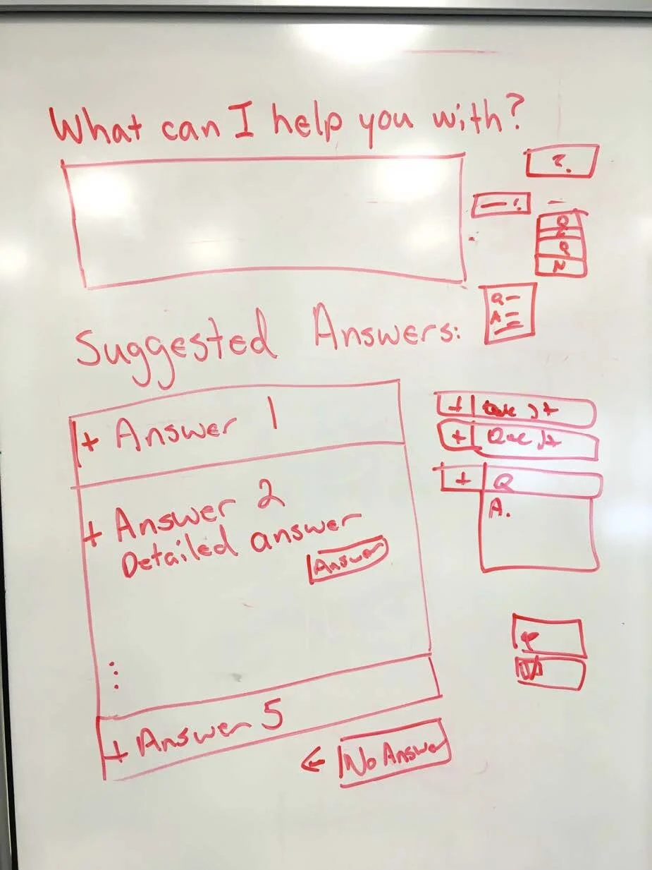 In our whiteboard ideation session, we finalized the design for the FAQ/Search flow. A key decision was choosing a search field over a textarea to encourage concise questions. Our plan included returning a minimum of five results to users, with an envisioned upvote mechanism to assess content accuracy and success. This approach aimed to collect valuable user feedback, guiding future implementations of the bot. Our strategy considered using this data point to present a singular, highly accurate response from the bot once it became active.