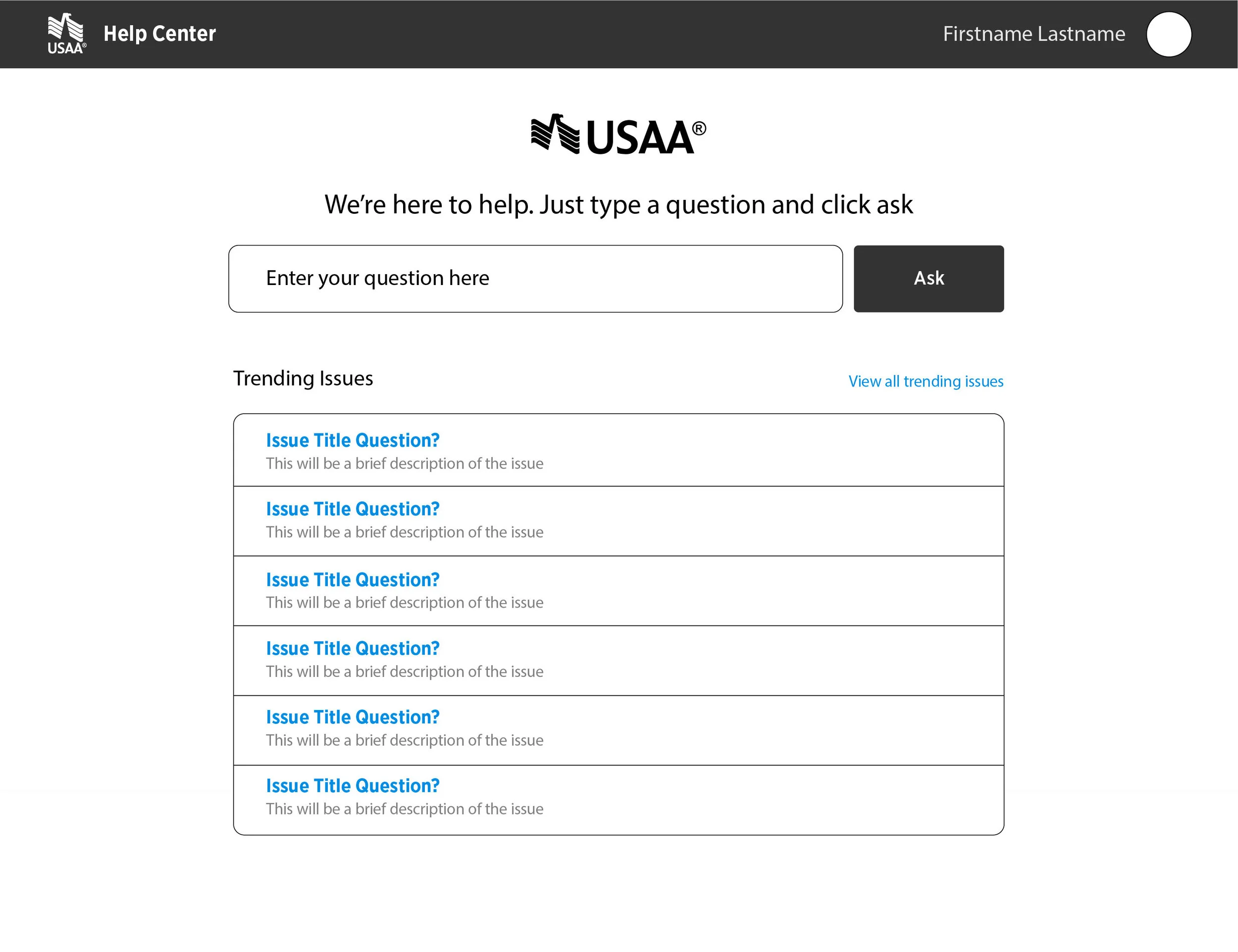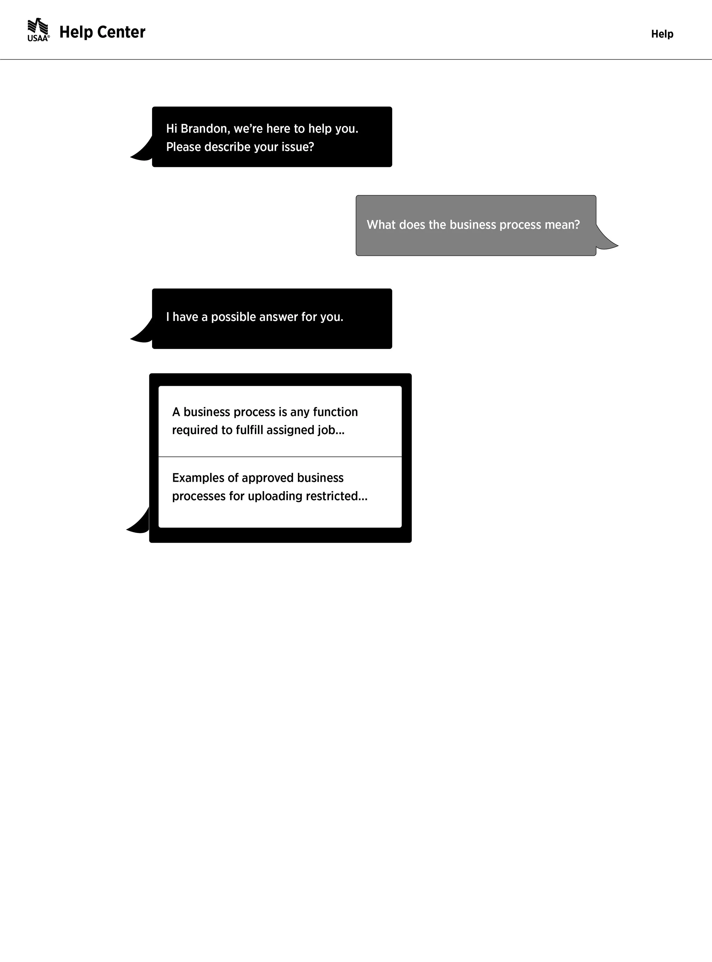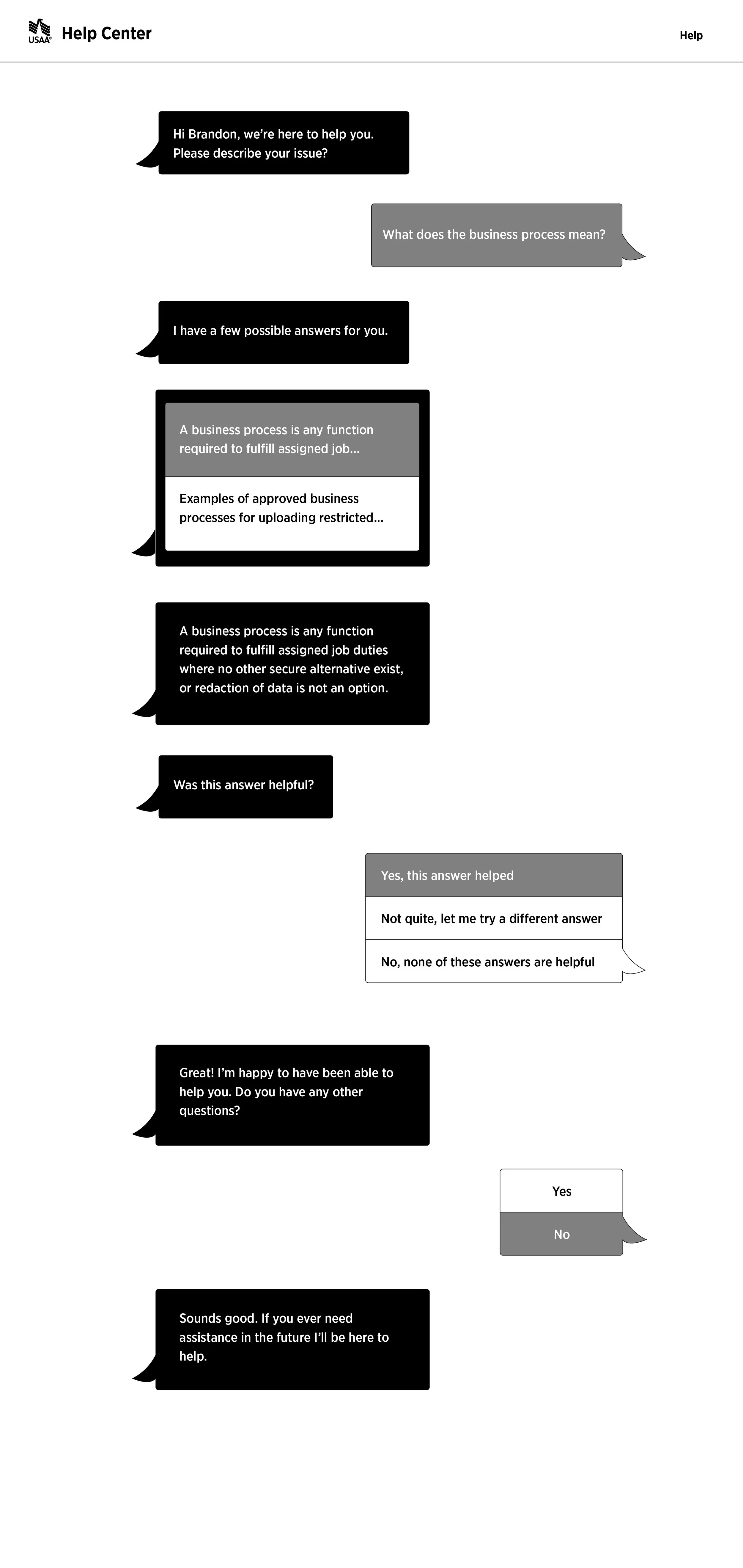 We ended up landing on two potential options. We combined the FAQ / “Ask Jeeves” options into one version. The FAQ website was built with HTML, CSS, and JavaScript (by me) and the back-end technology was incorporated by our developers. The chat bot prototype was also coded and presented to our business partners as well. The initial comps for the flow were built using Sketch.