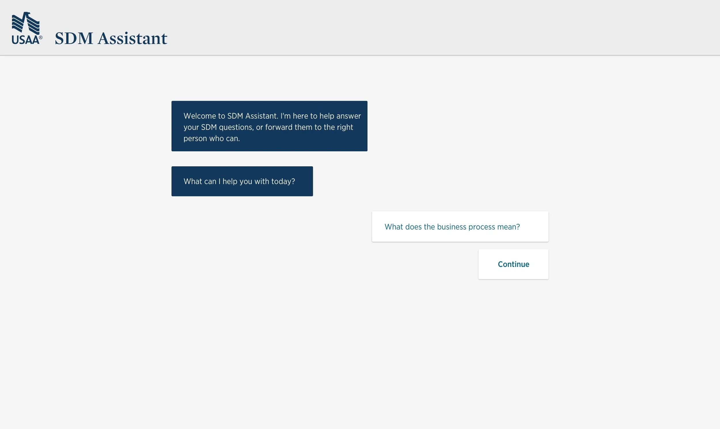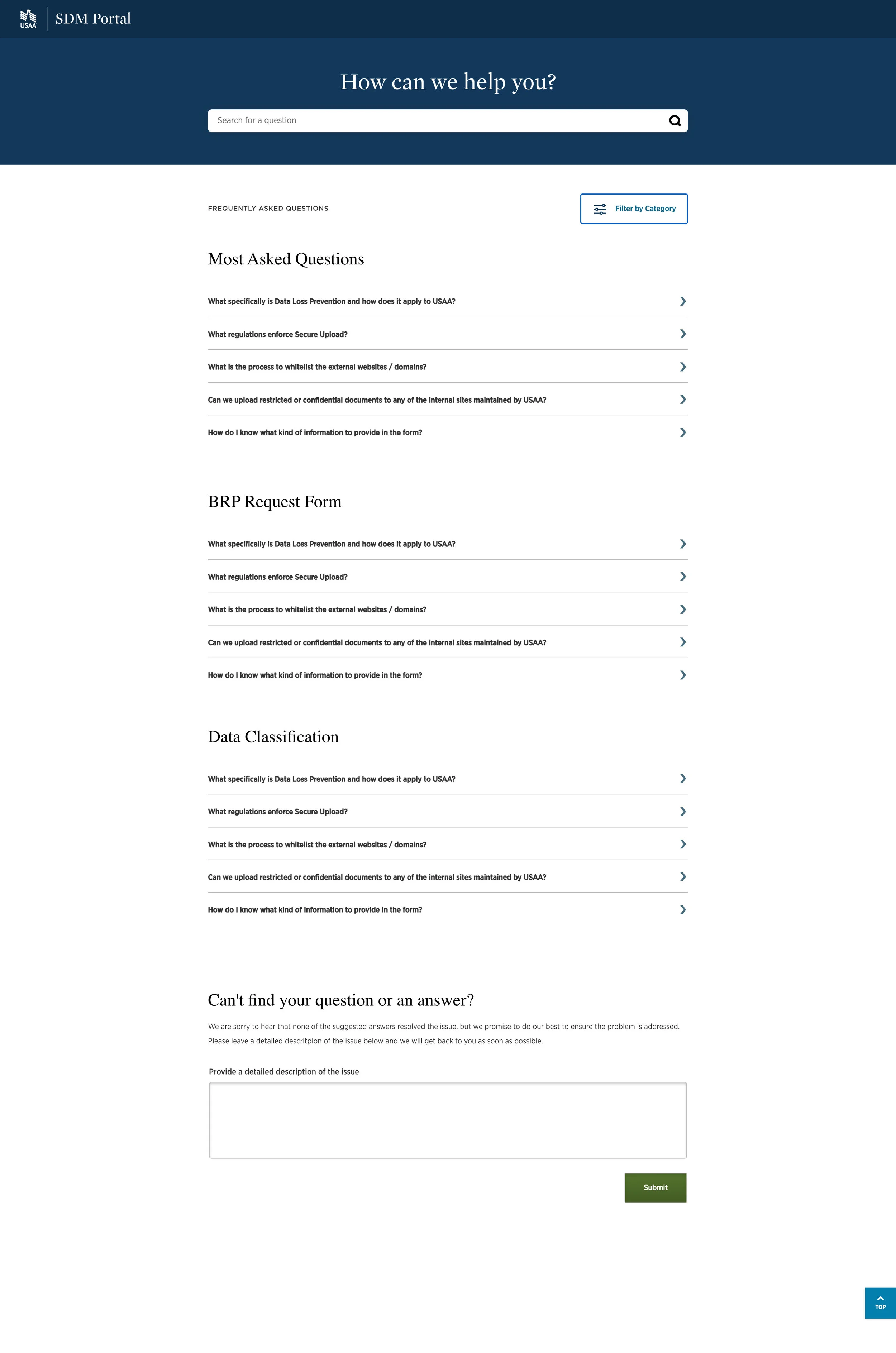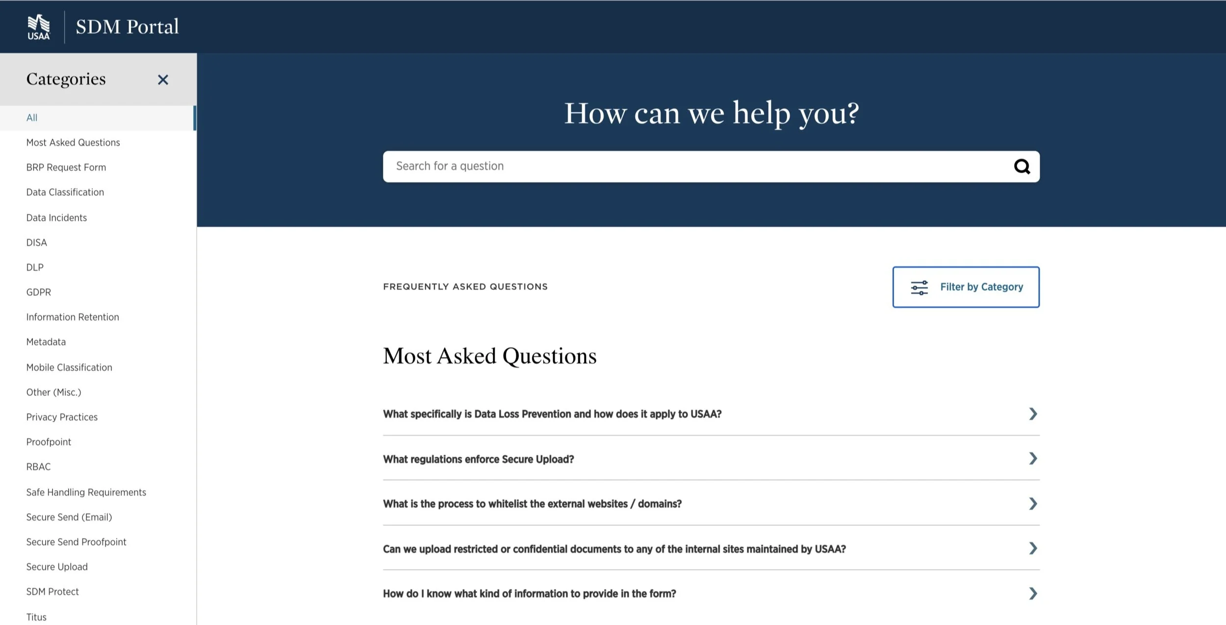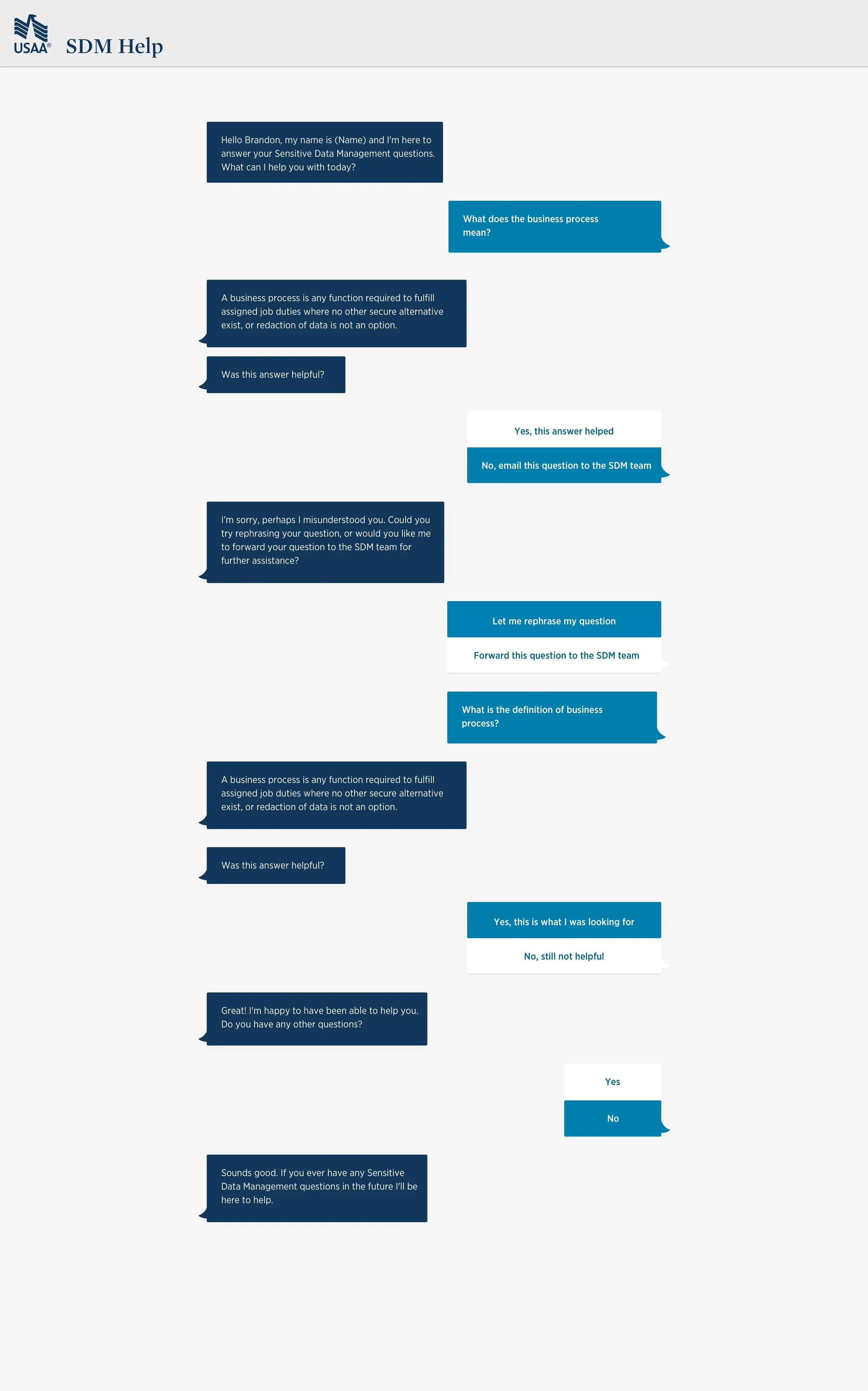 At the time of exploration, the Sensitive Data Management (SDM) team at USAA dedicated approximately 150 hours per week to address business inquiries related to sensitive data. To improve efficiency, we implemented an intelligent question-based search engine within an FAQ platform. This manual mapping of various question-answer pairs reduced the time spent on repetitive inquiries by 10%. While this served as an interim solution, the ultimate objective was to build a data foundation for a future chatbot. This strategic move aimed to prevent the need for substantial investments in hiring additional offshore and onshore resources to handle data management inquiries.